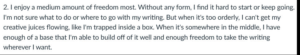 Throughout this course, I’ve had to keep a keen eye on my own writing processes to be able to adapt them to reach the goals required by assignments. I feel my initial ability to reflect on my own writing process can be seen through the Unit 3 Essay and its revision, although I admittedly don’t completely reflect on how my process works in those works. My actual ability is better shown firstly in Reading Response 7, as shown below, when I reflected on how much freedom I enjoyed while writing. It’s also shown in the Unit Two Project, where I finally understand how my writing process works and where I went wrong in my previous reflections. My ability to adapt my process is best shown through the Unit Four Paper, where I’m able to adapt my distracted and disorganized process to make an academic paper by using structure ahead of time.